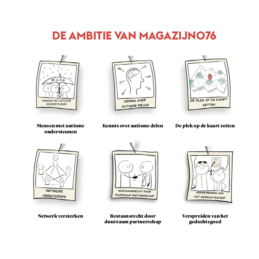 Magazijn biedt een andere kijk op de vraagstelling en begeleiding van mensen met autisme. Een kenniscentrum, niet alleen in de boeken maar ook met de mensen die er zijn. Zo is er niet alleen 20 jaar aan ervaring aan begeleiding en kennis, maar kan er ook eigen ervaring met autisme ingezet worden. Iedere professional met een vraag is welkom.
