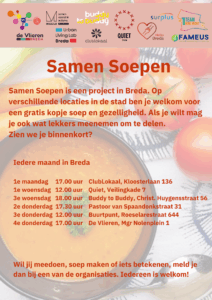 Een voorbeeld hiervan is de samenwerking tussen Magazijn en FAMEUS. Elke tweede donderdag van de maand maken en serveren wij soep bij FAMEUS (Pastoor van Spaandonkstraat 31, Breda). Een vrijwilliger van Magazijn kookt samen met de bezoekers van FAMEUS soep, die we rond 17.30 uur in een gemoedelijke sfeer samen opeten. Verbinding, nieuwe contacten, mooie gesprekken zijn vaste ingrediënten van ‘Samen Soepen’. Als je wilt mag je ook wat lekkers meenemen om te delen. Zien we je binnenkort?