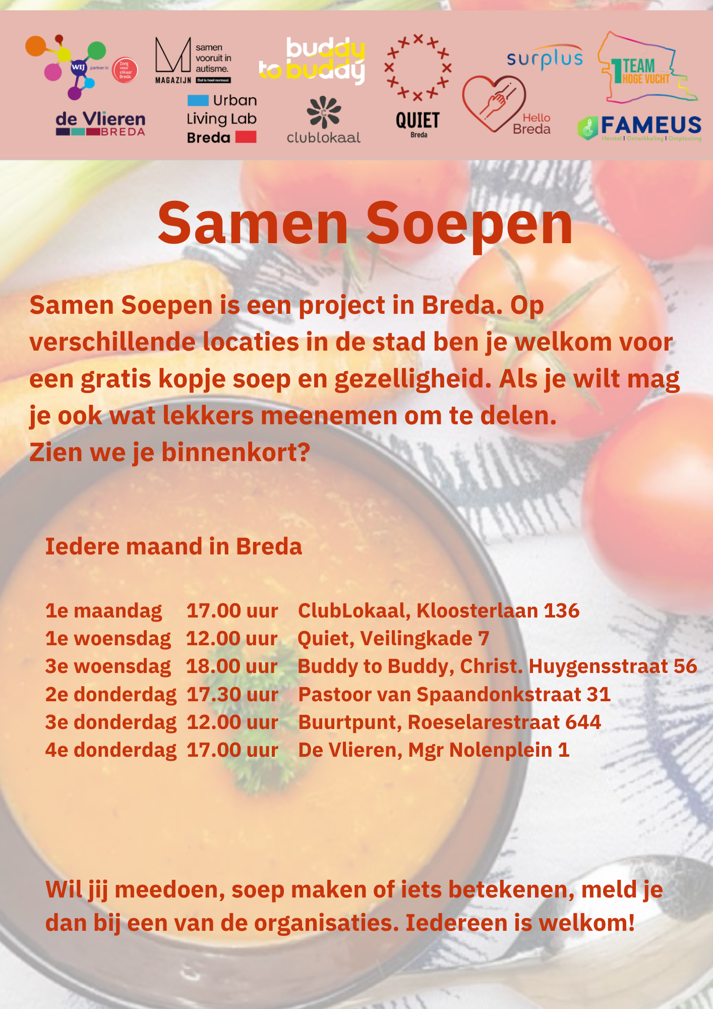 Wil jij meedoen, soep maken of iets betekenen, meld je dan aan bij één van de organisaties. Iedereen is welkom!